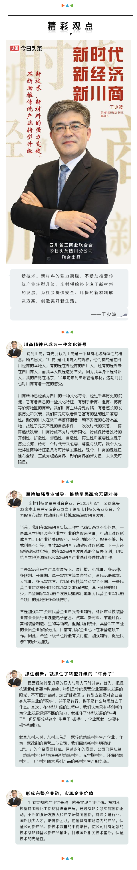 作為川內(nèi)新材料行業(yè)的排頭兵、國內(nèi)絕緣材料企業(yè)領(lǐng)軍企業(yè)的帶頭人,日前,四川東材科技集團(tuán)股份有限公司公司黨委書記、董事長于少波作為新川商代表接受了《今日頭條》的專訪,分享了他對于新川商、軍民融合產(chǎn)業(yè)發(fā)展、民營企業(yè)轉(zhuǎn)型升級的看法以及未來規(guī)劃等內(nèi)容。